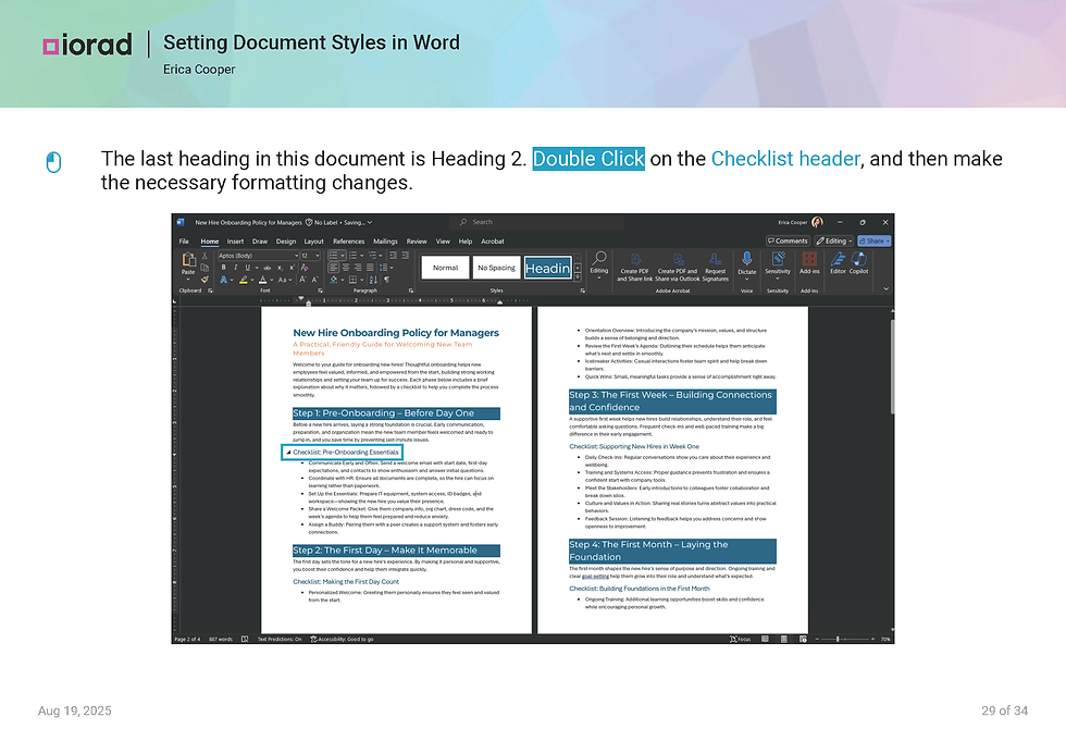 Step-by-Step Guidance: Learners are guided through each action with clear instructions and visual cues, ensuring they understand both the “how” and the “why” behind each formatting choice.