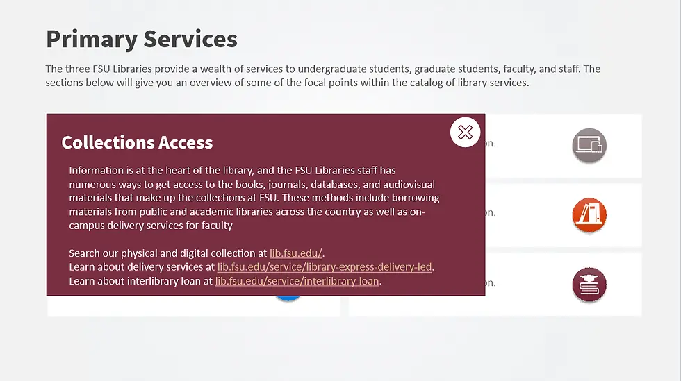 The example orientation module, built entirely in Storyline, was intended for new hires at Florida State University’s main library—Strozier. The library has a large population of temporary, part-time undergraduate employees, but there wasn’t yet a universal module all departments could use during the onboarding of these employees. I created this as a proof-of-concept module during my time at Strozier, and it was designed as an entirely asynchronous online lesson providing an overview of the library’s internal structure and primary services. Overall, this concept project demonstrates my skills in instructional design, learner engagement, content development, and onboarding program development.